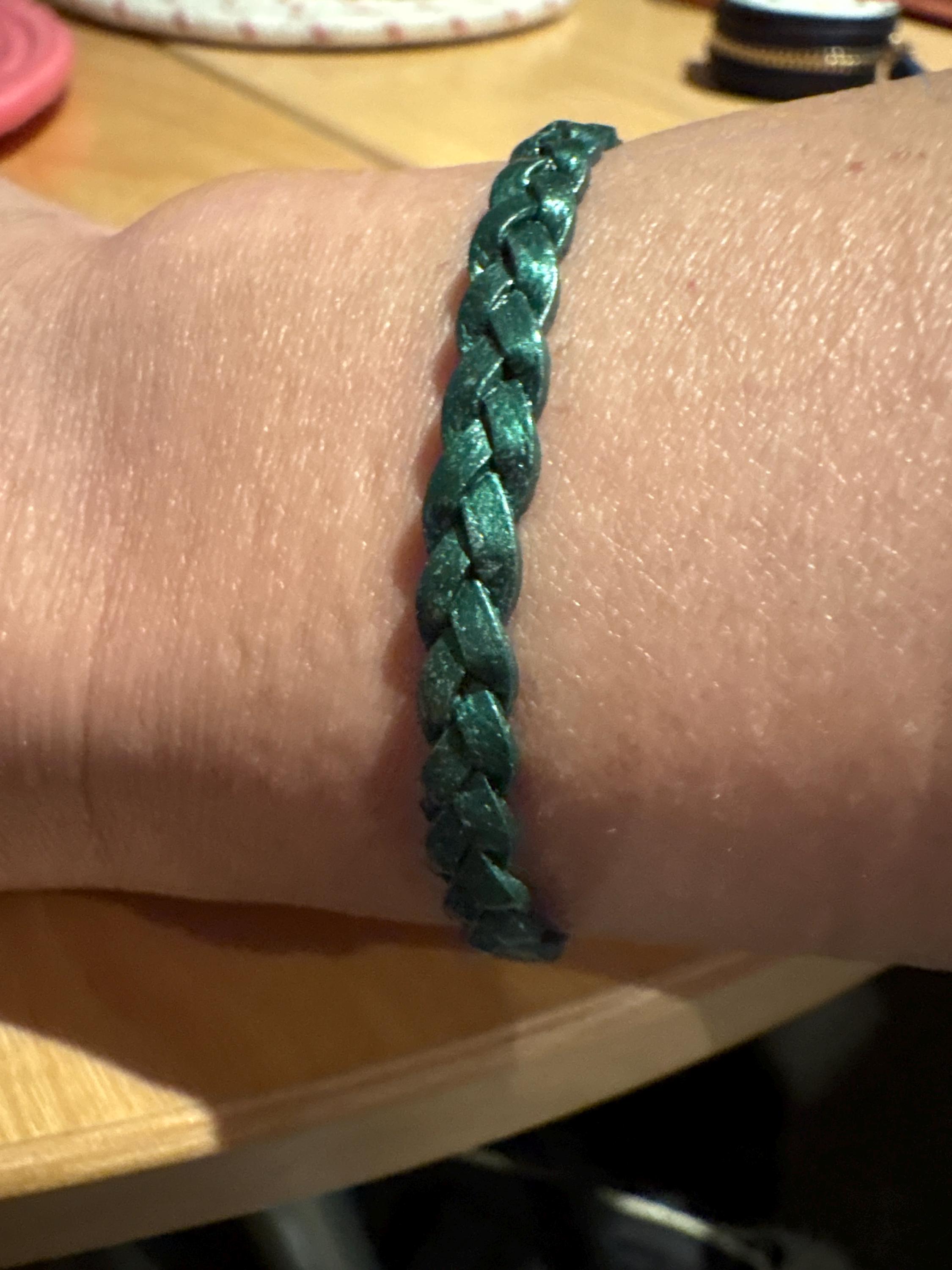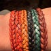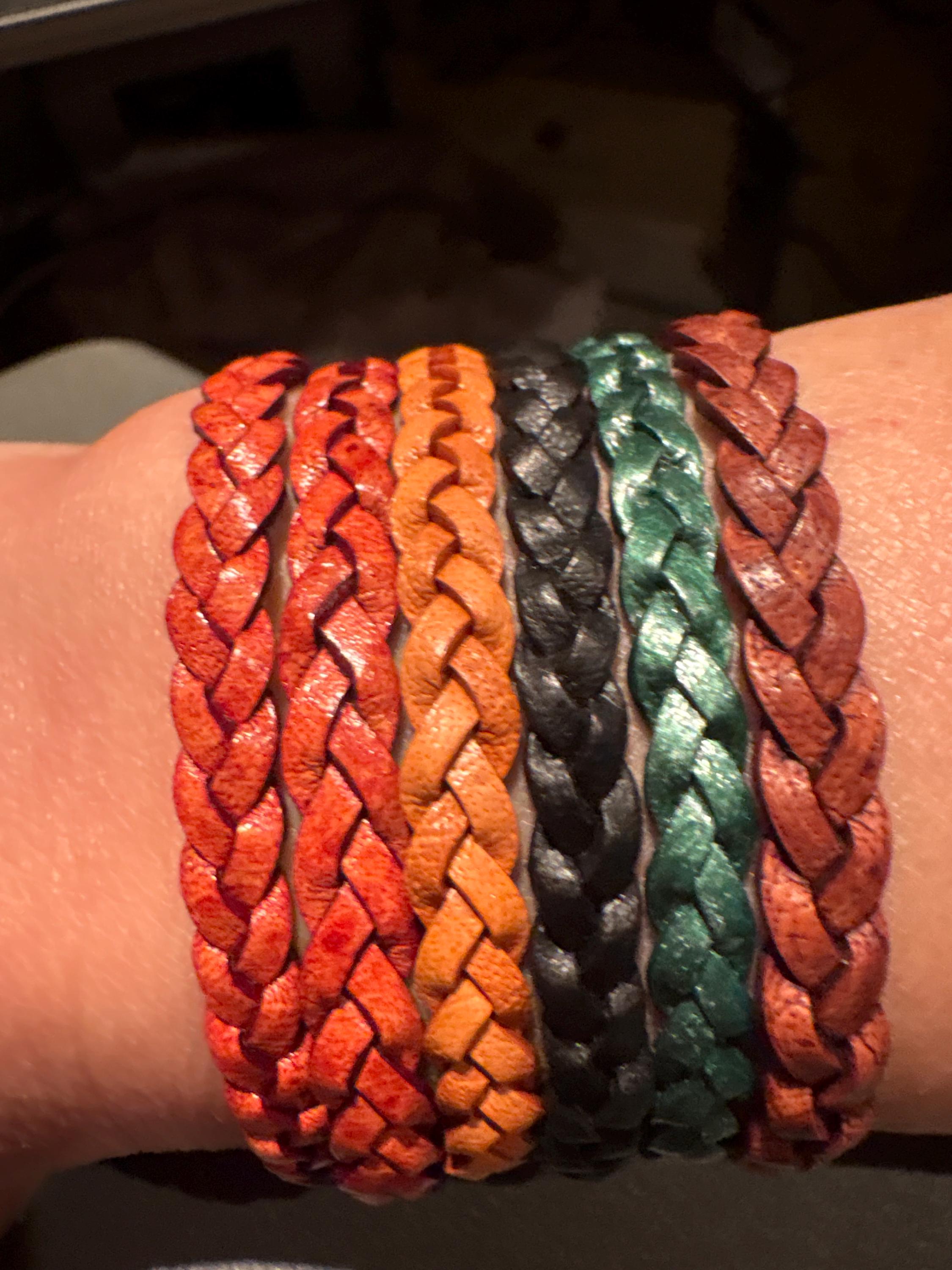 From left to right: turkey red, turkey red (wanted to show that thickness can vary, but I still love both!), tan, black, metallic green, antique brown (I thought would be lighter in color and have more polish but still high quality) I think im addicted to these bracelets and will order more as gifts and maybe a metallic blue one for myself
