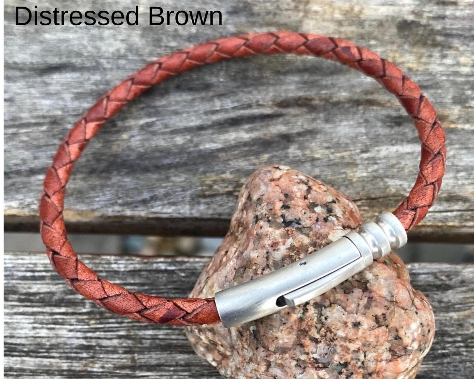 These trendy and thin 4 mm braided men's leather bracelets are made of high-quality leather and a stainless steel locking clasp. Thin is in!